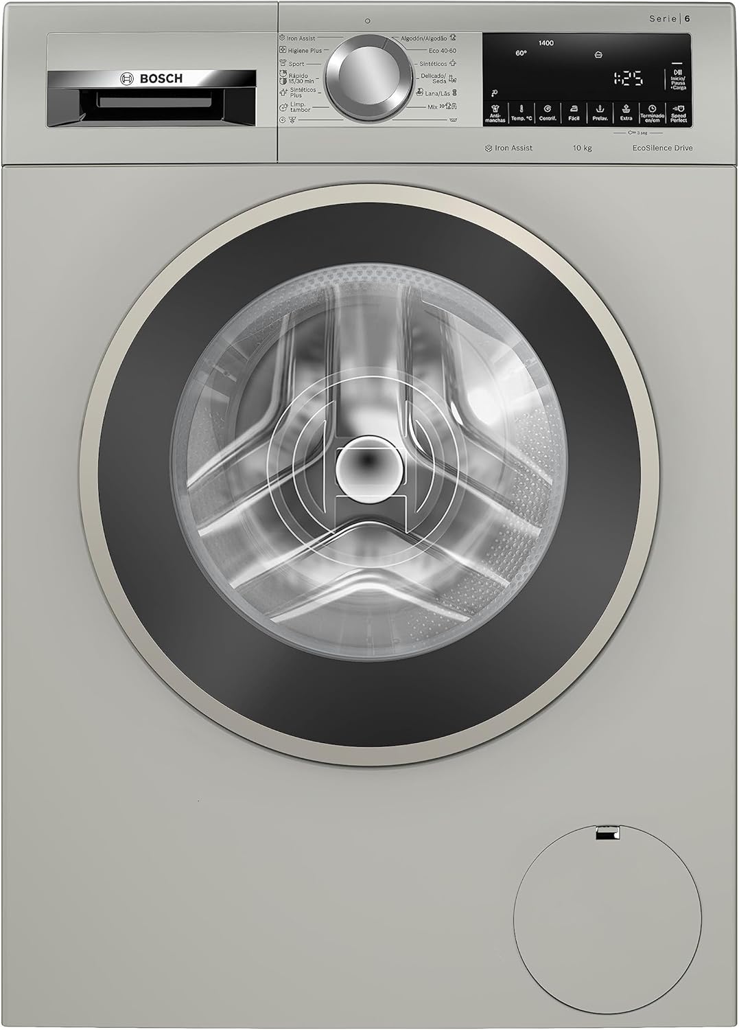 Lavadora Bosch de carga frontal con capacidad de 10 kg, pantalla digital y programas eficientes para lavado diario.